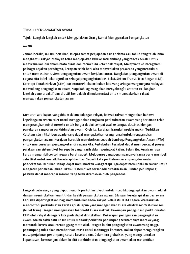 Terdapat beberapa cara yang boleh dilakukan untuk memperbaiki sistem pengangkutan awam di malaysia berdasarkan masalah pengangkutan awam yang telah diutarakan oleh pengguna. Sesungguhnya, kemajuan dalam pengangkutan awam yang disokong sepenuhnya oleh rakyat malaysia akan dapat meningkatkan kualiti hidup dan kesejahteraan insan seiring dalam memenuhi aspirasi negara menjelang pencapaian wawasan 2020. Lima langkah utama bagi meningkatkan penggunaan pengangkutan awam 1. Memang sudah ada banyak usaha yang dilakukan untuk menyatukan semua perkhidmatan ini tetapi kejayaannya masih jauh lagi. Zaman beralih, musim bertukar, selepas tamat penjajahan asing selama 446 tahun yang telah lama menghantui rakyat, malaysia telah menjejakkan kaki ke satu ambang yang rancak sekali. Peranan pelbagai pihak untuk menggalakkan industri pelancongan di malaysia. Antara perkhidmatan pengangkutan awam yang popular ialah perkhidmatan bas dan teksi. Kerajaan juga telah mengadakan pelbagai langkah untuk menggalakkan orang ramai supaya menggunakan pengangkutan awam bagi mengatasi masalah kesesakan khususnya di kawasan bandar. Oleh itu, pelbagai kemelut yang melanda. Menyelaras kapasiti sistem yang sudah mencapai hadnya. Secara tamsilnya, perjalanan dari kuala lumpur ke penang dengan memandu kereta. 14 jenis jenis karangan berserta contohnya terbagi menjadi karangan ilmiah, semi ilmiah, dan non ilmiah dibahas lengkap dalam artikel ini. Sehingga kini, perkhidmatan pengangkutan awam di malaysia dikatakan masih belum memuaskan hati kebanyakan pengguna bersetuju bahawa kadar tambang tidak sepadan dengan kualiti perkhidmatan.