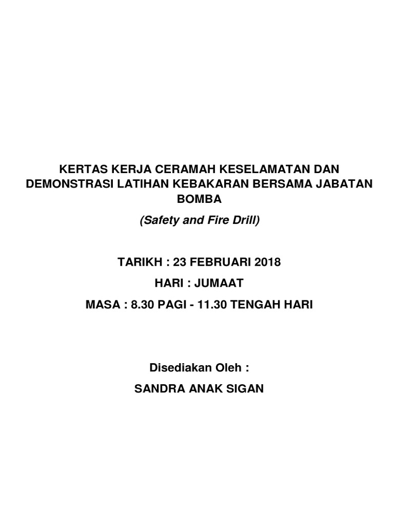 Kertas Kerja Lampiran Surat Latihan Kebakaran Bersama Bomba Skst 20 from image.slidesharecdn.com Sistem simulasi kebakaran dräger yang dioperasikan dengan gas dirancang sesuai dengan persyaratan din. Fire dril part 1 meskupun cuma latihan sendaknya semua kru harus serius melakukan drill karena dalam situasi sebenarnya situasinya sangatlah panik temen2 dikapal dalam skr tak seperti dulu karena banyaknya kasus kebakaran yang merenggut korban jiwa saat ini para pelaut dalam sudah sadar. Terdapat banyak kes kebakaran yang telah melibatkan kemalangan nyawa dan hilangnya tempat tinggal di malaysia. Latihan kebakaran boleh kurangkan risiko kebakaran. Program latihan kebakaran atau fire drill sekarang lebih dikenali sebagai program pengosongan bangunan ataupun pengunsian bangunan ketika kebakaran berlaku di sekolah. Jadi, latihan drill and drill adalah latihan terkait sistem yang dirancang untuk personel unit dan koneksi pemadam kebakaran. Mereka nampaknya cukup berani menggunakan paip bomba dan tidak takut dengan api yang panas membara. Posted on may 5, 2017 by cahayamelur.