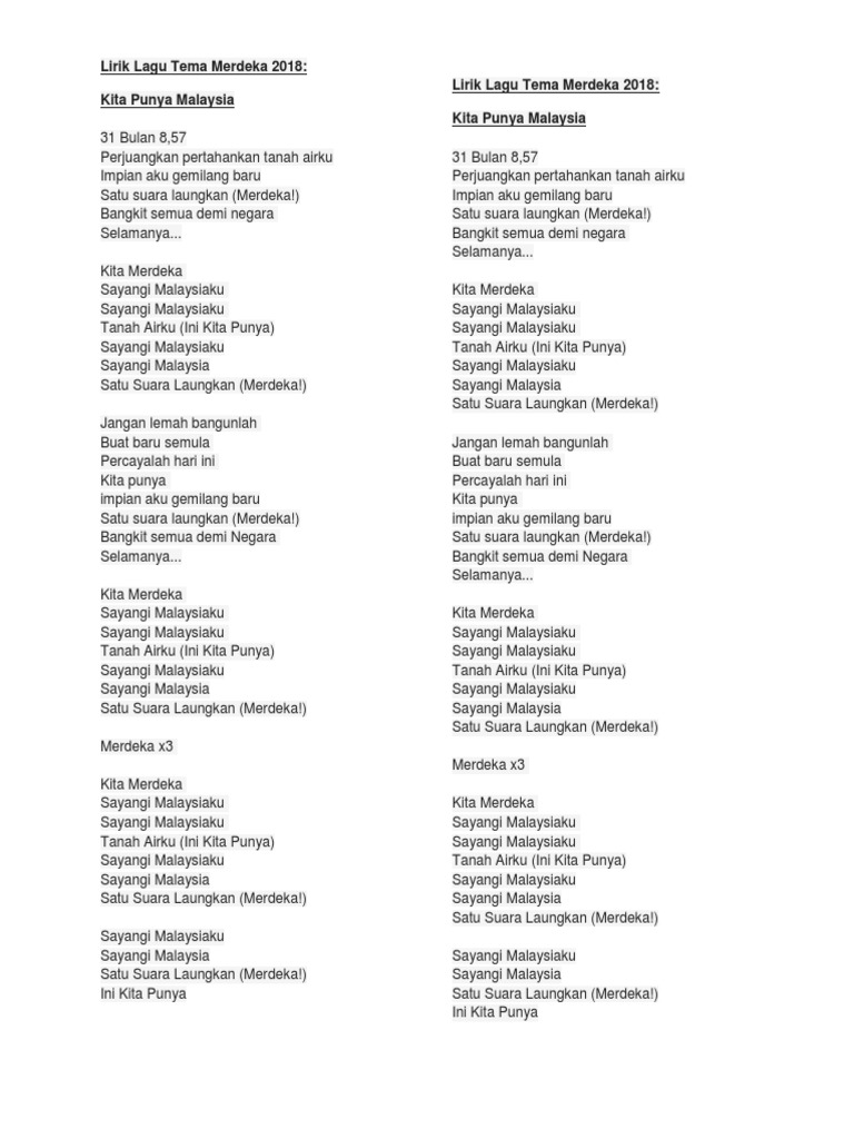 Menteri komunikasi dan multimedia, gobind singh deo berkata, lagu tersebut dipilih daripada beberapa lagu penyanyi lain yang diterima untuk sambutan pada acara tersebut. Sayangi malaysiaku sayangi malaysiaku tanah airku (ini kita punya) sayangi malaysiaku sayangi malaysia satu suara laungkan (merdeka!) jangan lemah bangunlah buat baru semula percayalah hari ini kita punya Maksud lirik lagu malaysia kita punya. Idaman hati obat lah rindu di hati. Lagu dan lirik hari kebangsaan 2018 : Sam bunkfacelirik kita punya malaysia : 31. Lirik lagu malaysia, indonesia, korea & antarabangsa. Newer post older post newsletter. More images for lirik lagu malaysia kita punya » Jul 28, 2018 · lirik lagu tema merdeka 2018: Posted on january 20, 2021 by. Untuk tahun ini, tema hari kebangsaan adalah sayangi malaysiaku malaysia bersih. Kita semua mahukan negara yang aman dan makmur agar nama malaysia terus makmur di persada dunia.